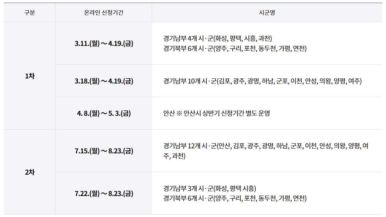 신청 기간은 24년 3월 11일(월) ~ 11월 15일(금)까지 기간 내 수시로 신청이 가능합니다. 단, 안산시는 24년 4월 8일 ~ 11월 15일(금)로 기간이 다릅니다.