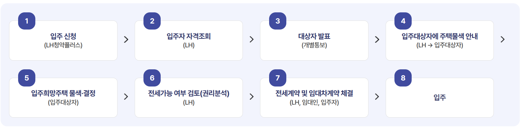 입주신청을 하면 LH에서 입주자격조회를 한 다음 입주대상자에게 개별 통보됩니다. 입주대상자에 주택물색을 안내해주고 예정자가 결정을 완료하면 LH에서 전세가능여부 검토 후 LH와 임대인 입주자가 계약을 체결하게 됩니다.