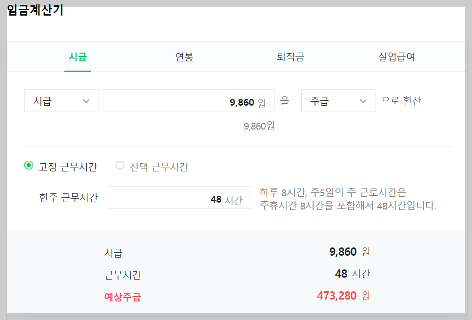 - 40시간 근무시 받게되는 금액은 주급 + 주휴수당 = 473,280원 입니다.