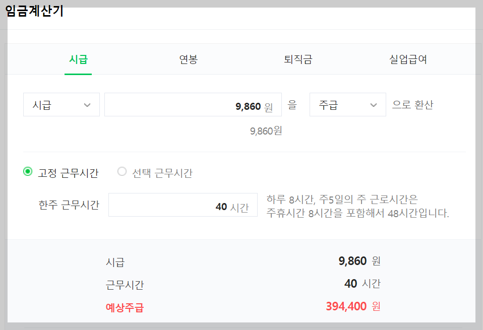 - 하루 8시간 주 5일 40시간 근무하는 경우 주급 : 394,400원