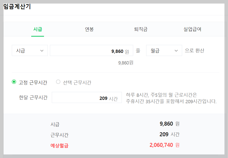 2024년 최저임금으로 월급으로 계산하는 경우 주 40시간, 월 209시간으로 환산할 시에 2,060,740원이 됩니다.