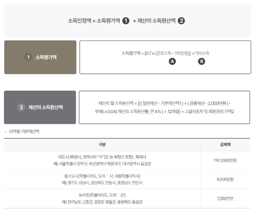 재산은 금융재산과 고급자동차, 회원권등의 재산을 소득으로 환산하게 됩니다. 이때 일부 공제가 가능하며 지역별에따라 기본 공제금액이 달라지게됩니다. 대도시는 1억 3,500만원이 공제되며, 중소도시는 8,500만원, 농어촌은 7,250만원을 공제해줍니다. 고급 자동차와 회원권은 공제가 되지 않습니다.