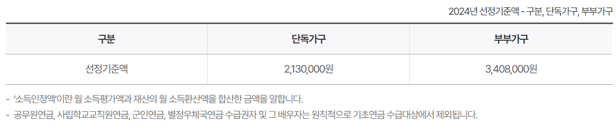 2024년 기준으로 선정기준액은 1인 단독가구인 경우 2,130,000원이며, 부부가구는 3,408,000원입니다. 부부 중 한명만 신청하더라도 부부가구로 적용됩니다.