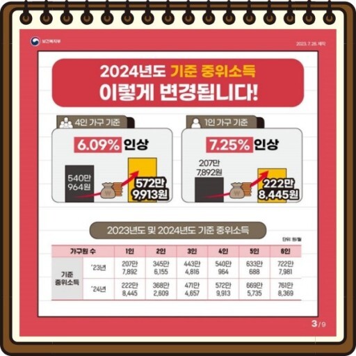2024년 4인가구를 기준으로 작년에 비해 중위소득이 6.09% 인상되었습니다. 따라서 수급자의 선정기준이 대폭 완화되었으며 정부에서는 최저보장수준을 높여 저소득층에게 더 많은 지원을 하게되었습니다.